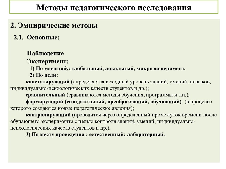 2. Эмпирические методы 2.1. Основные: Наблюдение Эксперимент: 1) По масштабу: глобальный, локальный, микроэксперимент. 2) По цели: констатирующий ( определяется исходный уровень знаний, умений, навыков, индивидуально-психологических качеств студентов и др.); сравнительный (сравниваются методы обучения, программы и т.п.); формирующий (созидательный, преобразующий, обучающий) (в процессе которого создаются новые педагогические явления); контролирующий (проводится через определенный промежуток времени после обучающего эксперимента с целью контроля знаний, умений, индивидуально-психологических качеств студентов и др.). 3) По месту проведения : естественный; лабораторный.