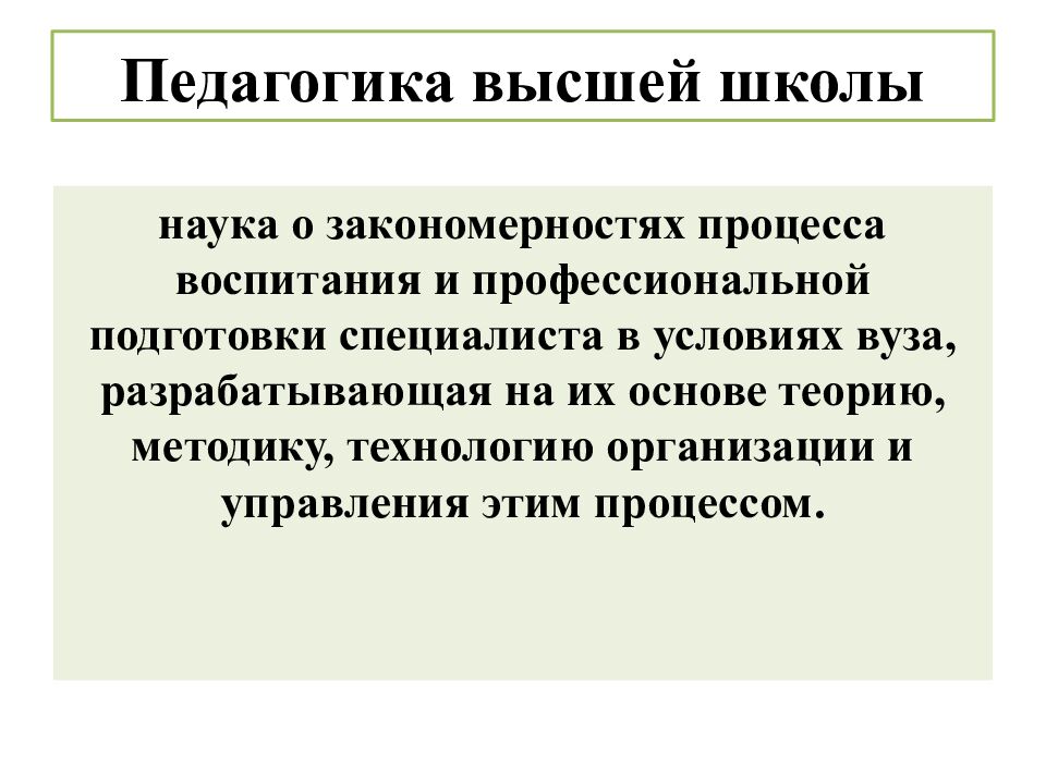 наука о закономерностях процесса воспитания и профессиональной подготовки специалиста в условиях вуза, разрабатывающая на их основе теорию, методику, технологию организации и управления этим процессом.