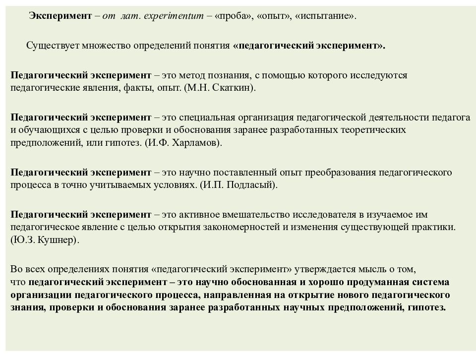 Эксперимент – от лат. experimentum – «проба», «опыт», «испытание». Существует множество определений понятия «педагогический эксперимент». Педагогический эксперимент – это метод познания, с помощью которого исследуются педагогические явления, факты, опыт. (М.Н. Скаткин ). Педагогический эксперимент – это специальная организация педагогической деятельности педагога и обучающихся с целью проверки и обоснования заранее разработанных теоретических предположений, или гипотез. (И.Ф. Харламов). Педагогический эксперимент – это научно поставленный опыт преобразования педагогического процесса в точно учитываемых условиях. (И.П. Подласый ). Педагогический эксперимент – это активное вмешательство исследователя в изучаемое им педагогическое явление с целью открытия закономерностей и изменения существующей практики. (Ю.З. Кушнер). Во всех определениях понятия «педагогический эксперимент» утверждается мысль о том, что педагогический эксперимент – это научно обоснованная и хорошо продуманная система организации педагогического процесса, направленная на открытие нового педагогического знания, проверки и обоснования заранее разработанных научных предположений, гипотез.