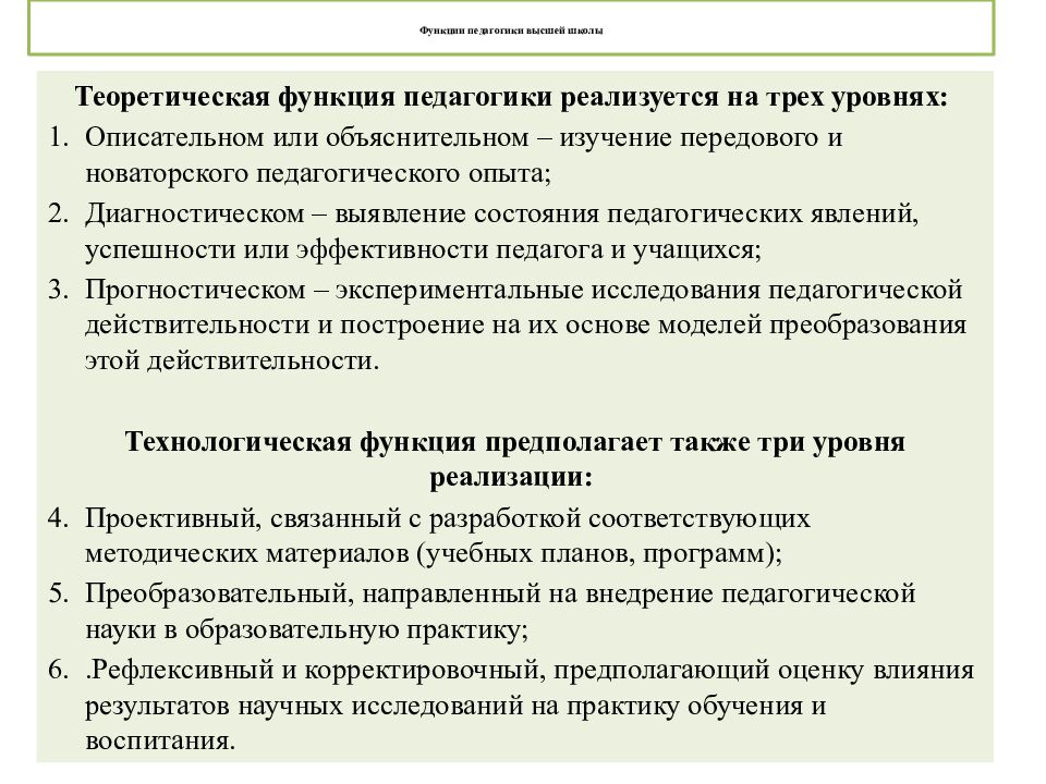 Теоретическая функция педагогики реализуется на трех уровнях: Описательном или объяснительном – изучение передового и новаторского педагогического опыта; Диагностическом – выявление состояния педагогических явлений, успешности или эффективности педагога и учащихся; Прогностическом – экспериментальные исследования педагогической действительности и построение на их основе моделей преобразования этой действительности. Технологическая функция предполагает также три уровня реализации: Проективный, связанный с разработкой соответствующих методических материалов (учебных планов, программ); Преобразовательный, направленный на внедрение педагогической науки в образовательную практику; .Рефлексивный и корректировочный, предполагающий оценку влияния результатов научных исследований на практику обучения и воспитания.