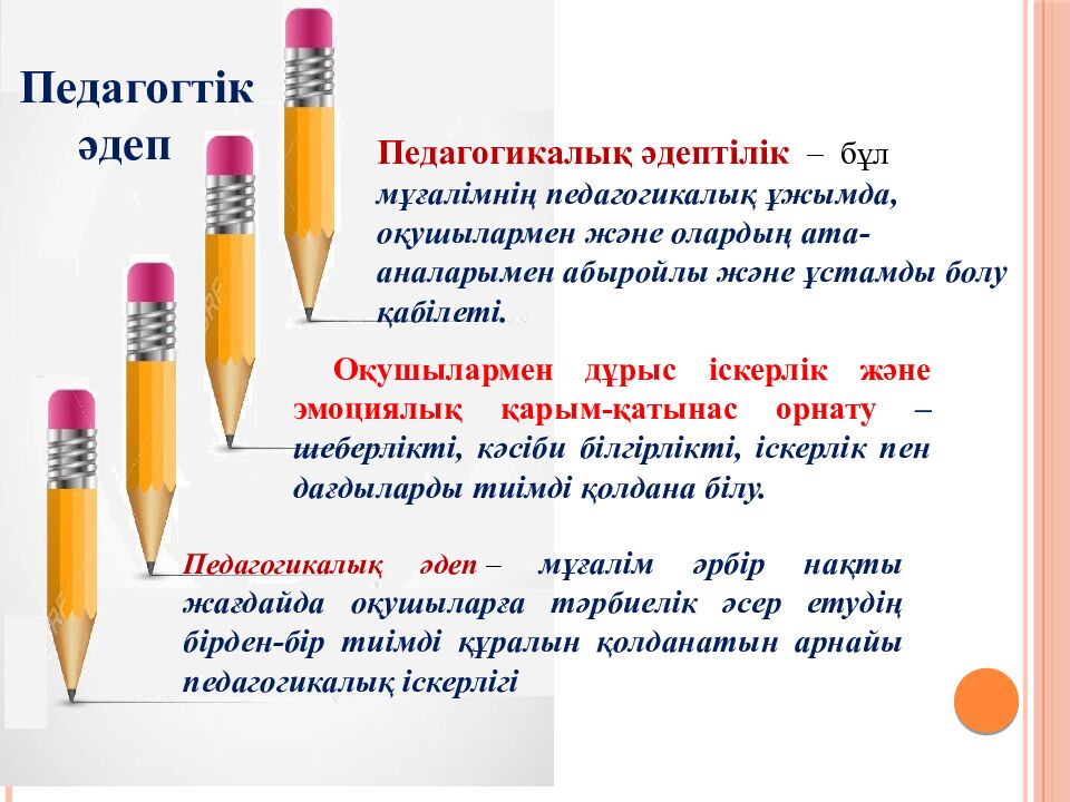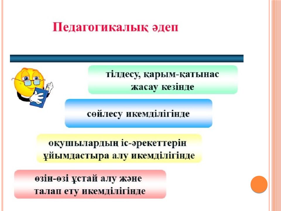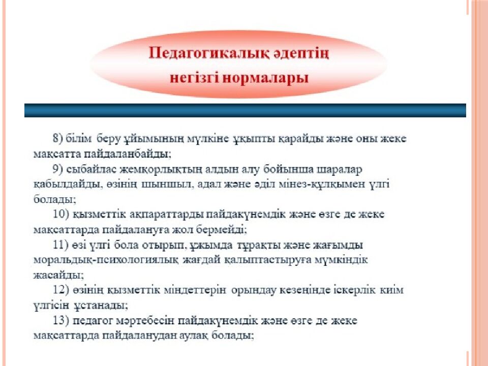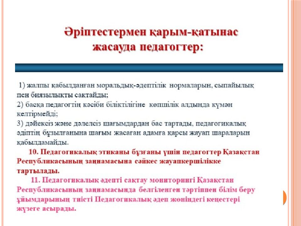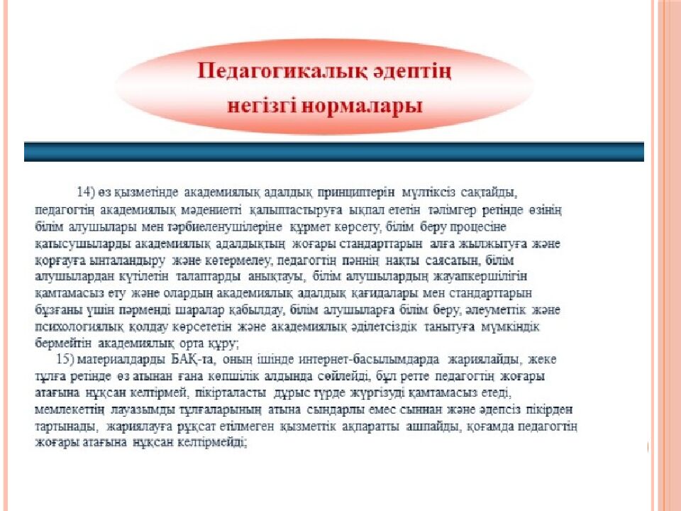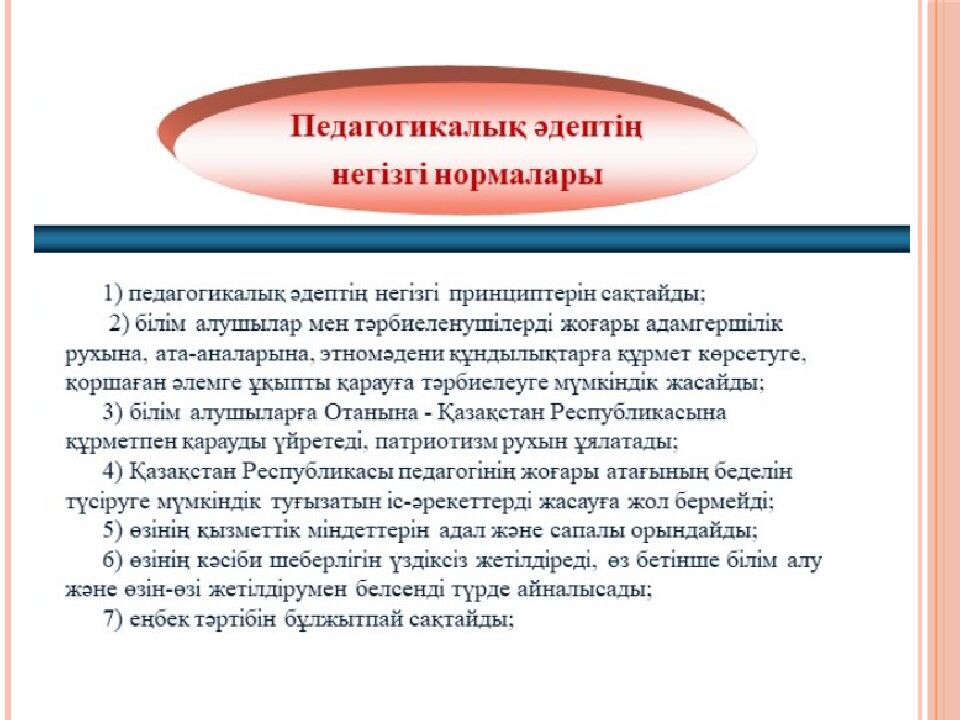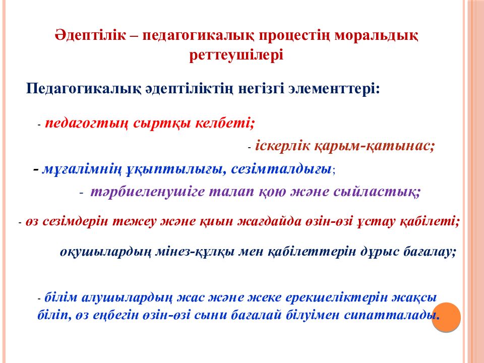 Педагогикалық әдептіліктің негізгі элементтері : Әдептілік – педагогикалық процестің моральдық реттеушілері - тәрбиеленушіге талап қою және сыйластық; - мұғалімнің ұқыптылығы, сезімталдығы ; - іскерлік қарым-қатынас; - педагогтың сыртқы келбеті ; - өз сезімдерін тежеу және қиын жағдайда өзін-өзі ұстау қабілеті; - білім алушылардың жас және жеке ерекшеліктерін жақсы біліп, өз еңбегін өзін-өзі сыни бағалай білуімен сипатталады. оқушылардың мінез-құлқы мен қабілеттерін дұрыс бағалау ;