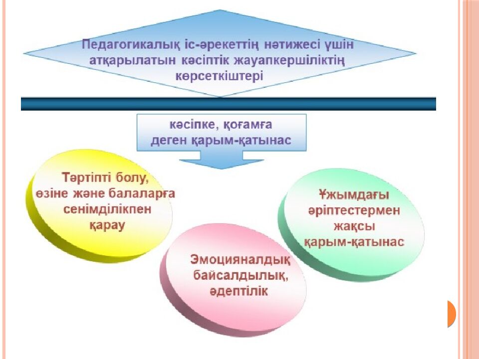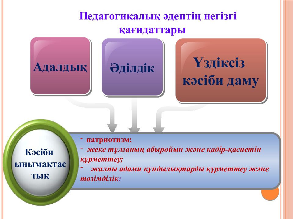 Адалдық Әділдік Үздіксіз кәсіби даму Педагогикалық әдептің негізгі қағидаттары патриотизм: жеке тұлғаның абыройын және қадір-қасиетін құрметтеу; жалпы адами құндылықтарды құрметтеу және төзімділік : Кәсіби ынымақтас тық