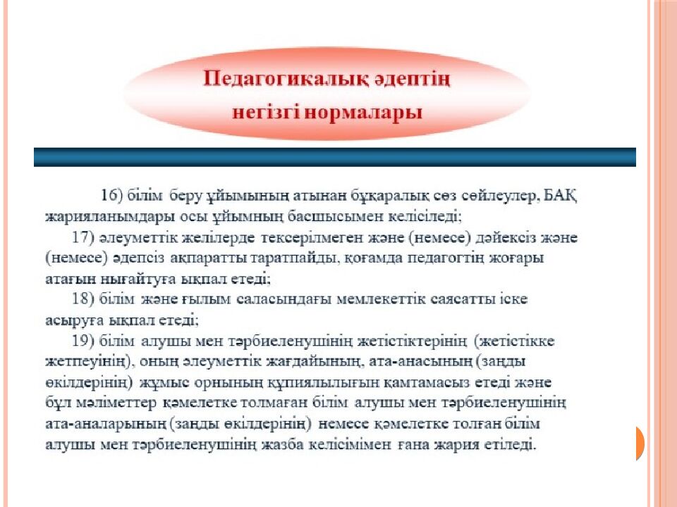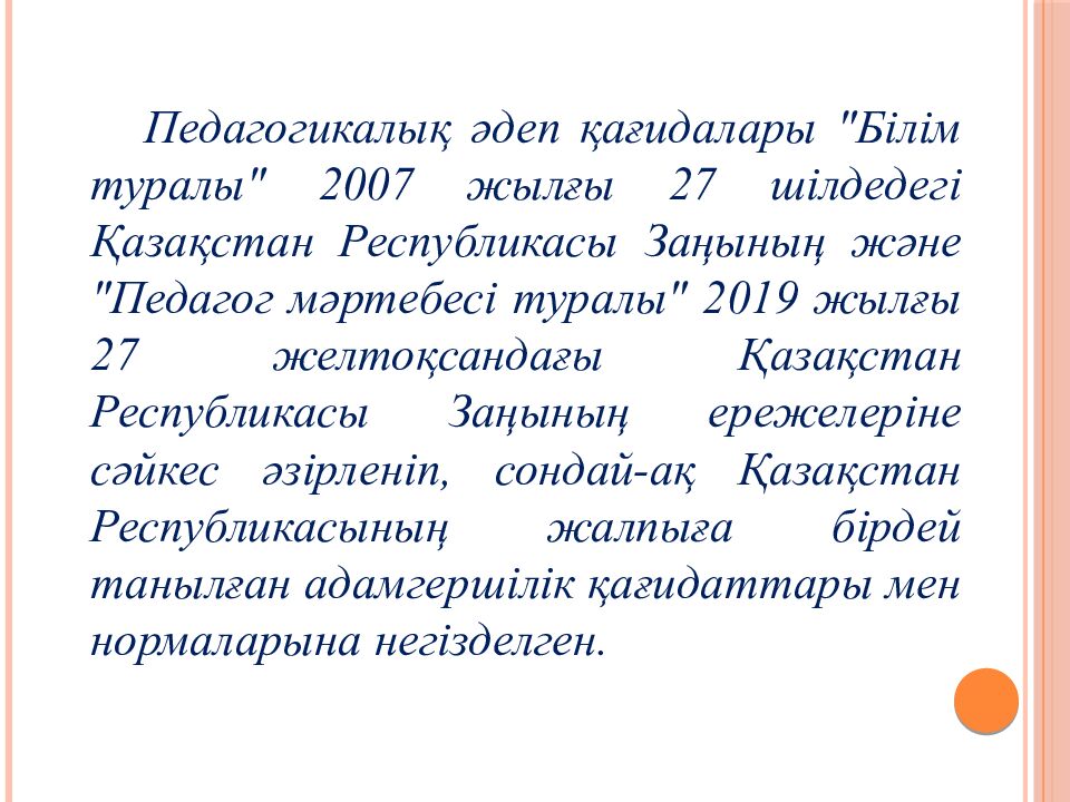 Педагогикалық әдеп қағидалары " Білім туралы " 2007 жылғы 27 шілдедегі Қазақстан Республикасы Заңының және "Педагог мәртебесі туралы " 2019 жылғы 27 желтоқсандағы Қазақстан Республикасы Заңының ережелеріне сәйкес әзірленіп, сондай-ақ Қазақстан Республикасының жалпыға бірдей танылған адамгершілік қағидаттары мен нормаларына негізделген.