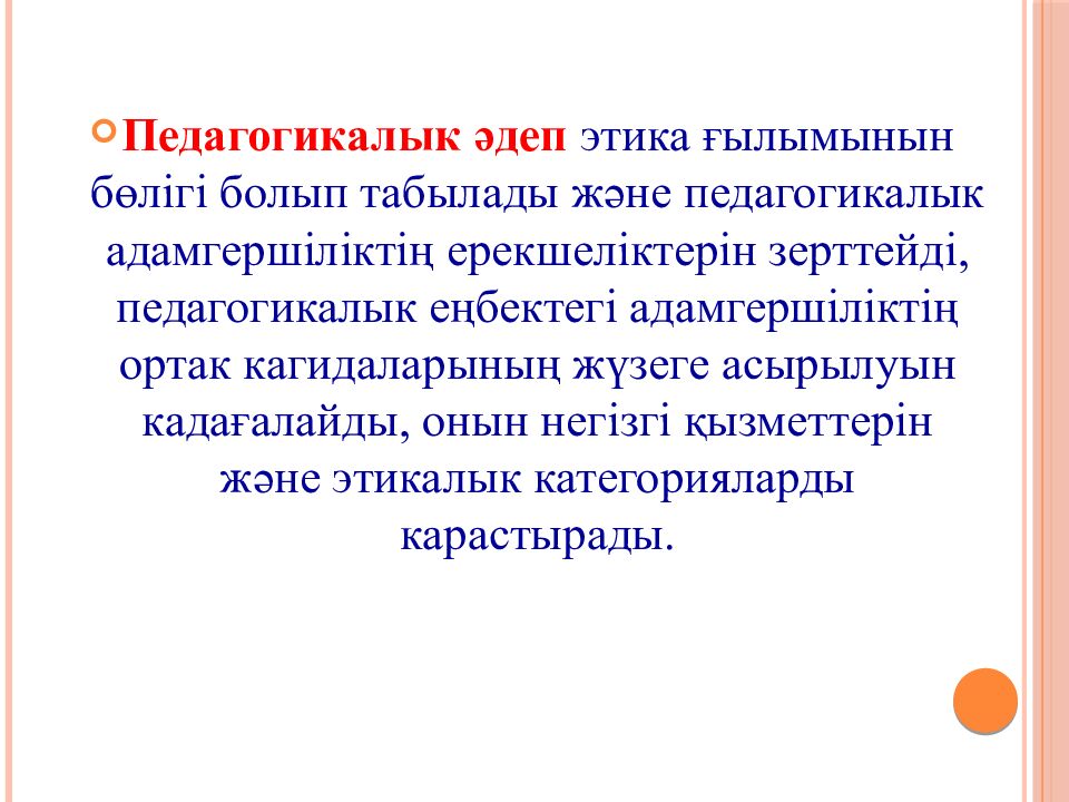 Педагогикалык әдеп этика ғылымынын бөлігі болып табылады және педагогикалык адамгершіліктің ерекшеліктерін зерттейді, педагогикалык еңбектегі адамгершіліктің ортак кагидаларының жүзеге асырылуын кадағалайды, онын негізгі қыз меттерін және этикалык категорияларды карастырады.