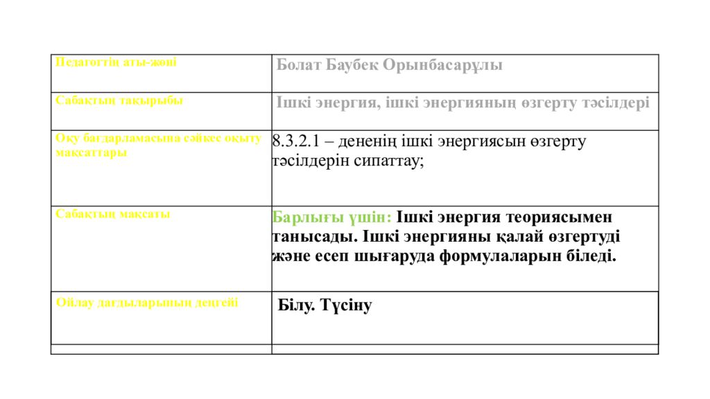 Последний слайд презентации: Педагогтің аты-жөні Болат Баубек Орынбасарұлы Сабақтың тақырыбы Ішкі энергия,