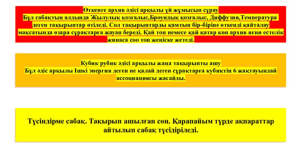 Өткенге архив әдісі арқылы үй жұмысын сұрау Бұл сабақтың алдында Жылулық қозғалыс,Броундық қозғалыс, Диффузия,Температура деген тақырыптар өтіледі. Сол тақырыптарды қамтып бір-біріне өткенді қайталау мақсатында өзара сұрақтарға жауап береді. Қай топ немесе қай қатар көп архив яғни естелік жинаса соо топ жеңіске жетеді. Кубик рубик әдісі арқылы жаңа тақырыпты ашу Бұл әдіс арқылы Ішкі энергия деген не қалай деген сұрақтарға кубиктің 6 жақтауындай ассоциациясы жасайды. Түсіндірме сабақ. Тақырып ашылған соң. Қарапайым түрде ақпараттар айтылып сабақ түсідіріледі.