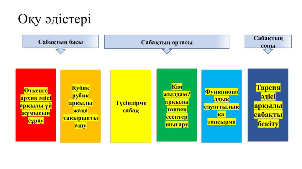 Оқу әдістері Сабақтың басы Сабақтың ортасы Сабақтың соңы Өткенге архив әдісі арқылы үй жұмысын сұрау Кубик рубик арқылы жаңа тақырыпты ашу Түсіндірме сабақ Кім жылдам? арқылы топпен есептер шығару Функционалдық сауаттылыққа тапсырма Тарсия әдісі арқылы сабақты бекіту