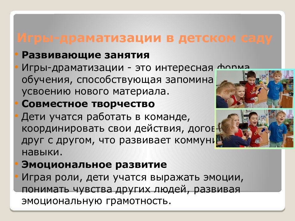 Развивающие занятия Игры-драматизации - это интересная форма обучения, способствующая запоминанию и усвоению нового материала. Совместное творчество Дети учатся работать в команде, координировать свои действия, договариваться друг с другом, что развивает коммуникативные навыки. Эмоциональное развитие Играя роли, дети учатся выражать эмоции, понимать чувства других людей, развивая эмоциональную грамотность.