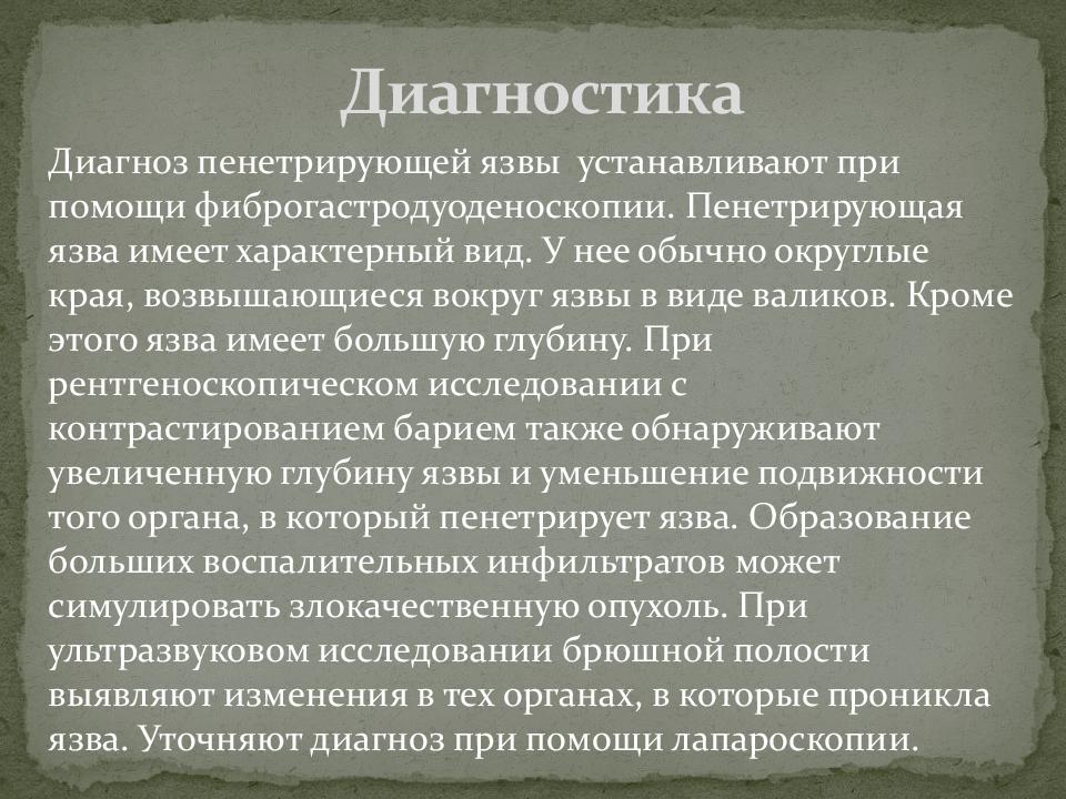 Диагноз пенетрирующей язвы устанавливают при помощи фиброгастродуоденоскопии. Пенетрирующая язва имеет характерный вид. У нее обычно округлые края, возвышающиеся вокруг язвы в виде валиков. Кроме этого язва имеет большую глубину. При рентгеноскопическом исследовании с контрастированием барием также обнаруживают увеличенную глубину язвы и уменьшение подвижности того органа, в который пенетрирует язва. Образование больших воспалительных инфильтратов может симулировать злокачественную опухоль. При ультразвуковом исследовании брюшной полости выявляют изменения в тех органах, в которые проникла язва. Уточняют диагноз при помощи лапароскопии.