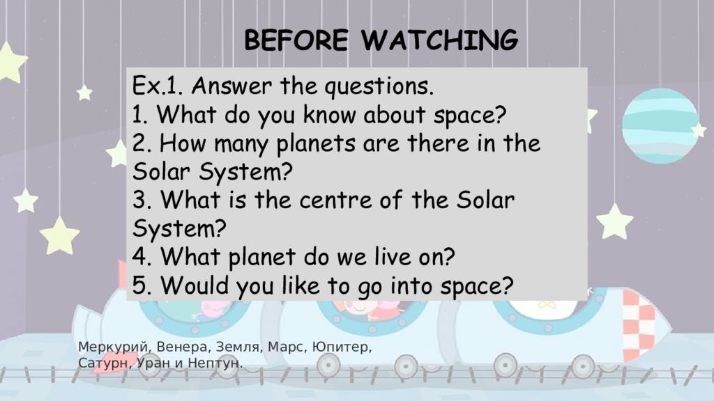 Ex.1. Answer the questions. 1. What do you know about space? 2. How many planets are there in the Solar System? 3. What is the centre of the Solar System? 4. What planet do we live on? 5. Would you like to go into space? BEFORE WATCHING Меркурий, Венера, Земля, Марс, Юпитер, Сатурн, Уран и Нептун.