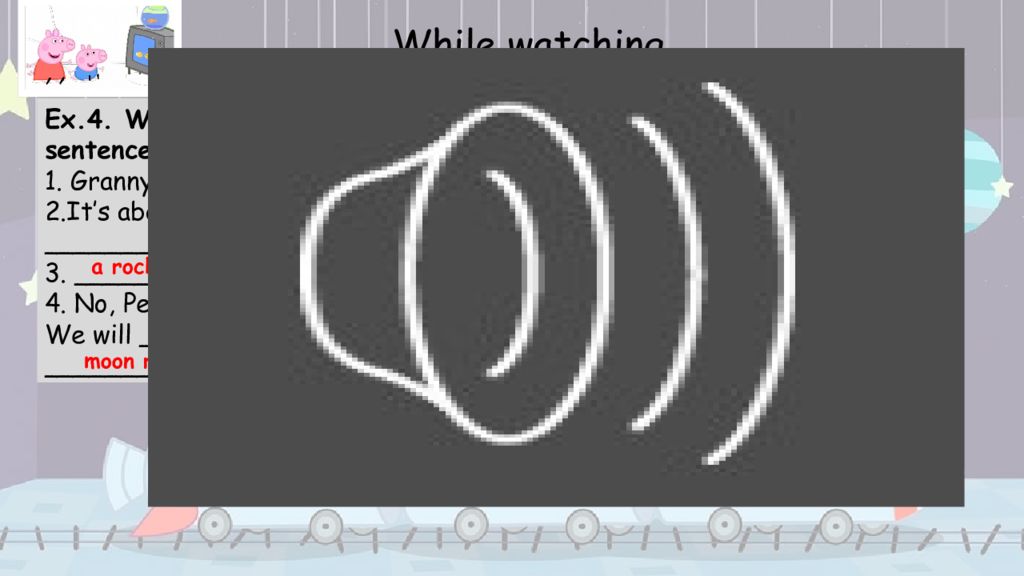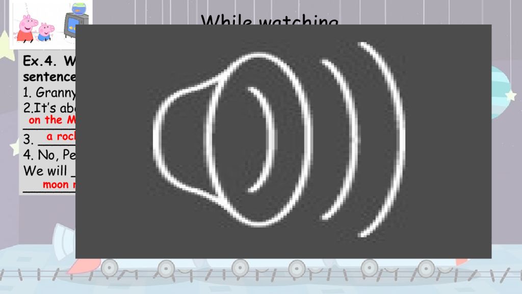 Ex.4. Watch the video and complete the sentences with the words from ex. 2. 1. Granny Pig is wearing a __________. 2. It’s about when people first landed __________a long time ago. 3. __________ is ready for blast-off. 4. No, Peppa, it’s just __________. We will __________ a flag and we will collect __________ While watching Ex.2.. 1. A rocket 2. To land on the Moon 3. A spacesuit 4. To plant a flag 5. To collect moon rocks 6. Pretend a spacesuit a rocket pretend plant a flag moon rocks