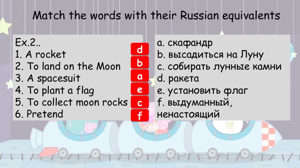 Ex.2.. 1. A rocket 2. To land on the Moon 3. A spacesuit 4. To plant a flag 5. To collect moon rocks 6. Pretend Match the words with their Russian equivalents a. скафандр b. высадиться на Луну c. собирать лунные камни d. ракета e. установить флаг f. выдуманный, ненастоящий d b a e c f