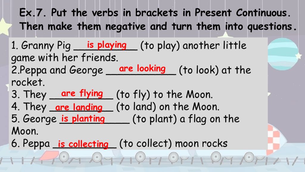 1. Granny Pig __________ (to play) another little game with her friends. 2. Peppa and George ___________ (to look) at the rocket. 3. They __________ (to fly) to the Moon. 4. They __________ (to land) on the Moon. 5. George ___________ (to plant) a flag on the Moon. 6. Peppa __________ (to collect) moon rocks Ex.7. Put the verbs in brackets in Present Continuous. Then make them negative and turn them into questions. is playing are looking are flying are landing is planting is collecting