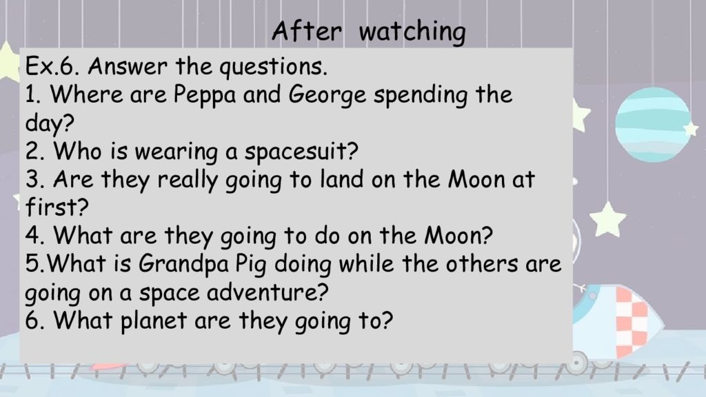Ex.6. Answer the questions. 1. Where are Peppa and George spending the day? 2. Who is wearing a spacesuit? 3. Are they really going to land on the Moon at first? 4. What are they going to do on the Moon? 5. What is Grandpa Pig doing while the others are going on a space adventure? 6. What planet are they going to? After watching