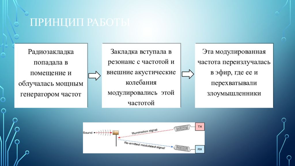 Радиозакладка попадала в помещение и облучалась мощным генератором частот Закладка вступала в резонанс с частотой и внешние акустические колебания модулировались этой частотой Эта модулированная частота переизлучалась в эфир, где ее и перехватывали злоумышленники