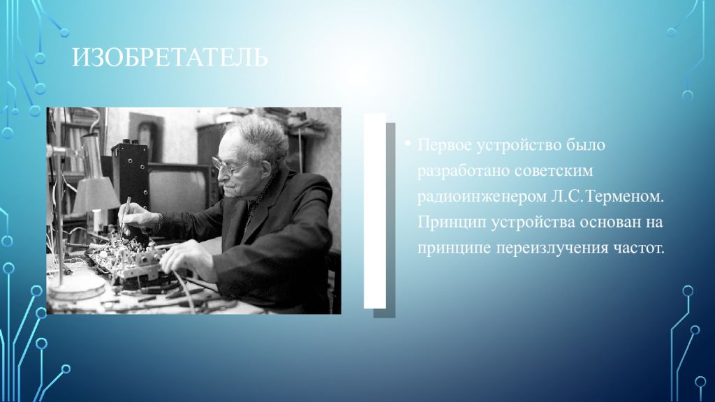 Первое устройство было разработано советским радиоинженером Л.С.Терменом. Принцип устройства основан на принципе переизлучения частот.