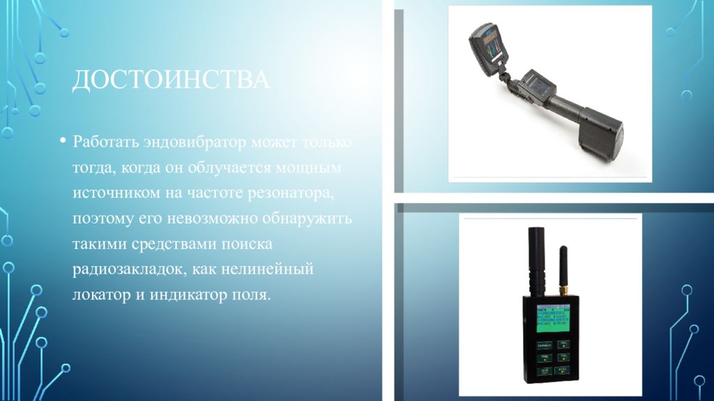 Работать эндовибратор может только тогда, когда он облучается мощным источником на частоте резонатора, поэтому его невозможно обнаружить такими средствами поиска радиозакладок, как нелинейный локатор и индикатор поля.