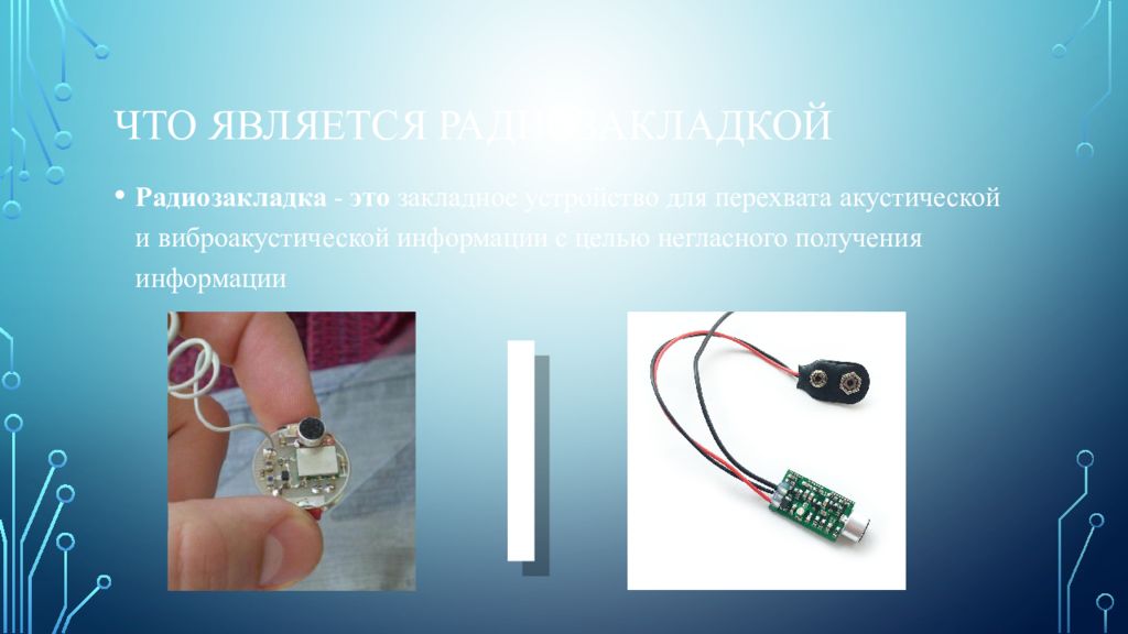 Радиозакладка - это закладное устройство для перехвата акустической и виброакустической информации с целью негласного получения информации