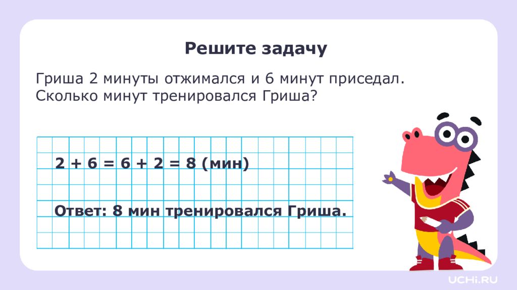 Решите задачу Гриша 2 минуты отжимался и 6 минут приседал. Сколько минут тренировался Гриша? 2 + 6 = 6 + 2 = 8 (мин) Ответ: 8 мин тренировался Гриша.
