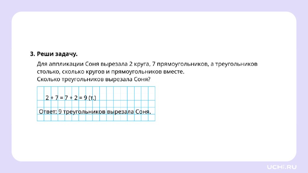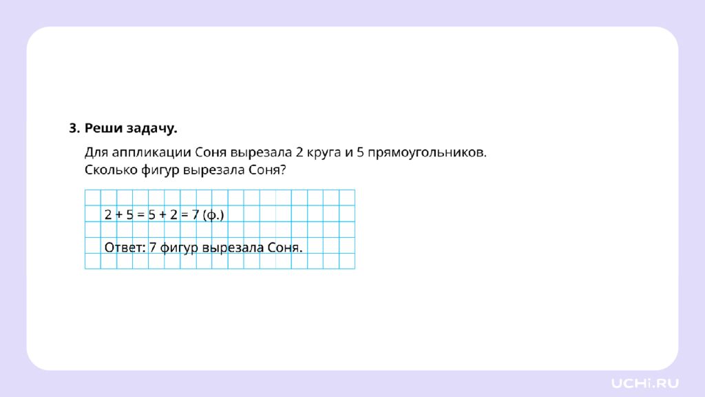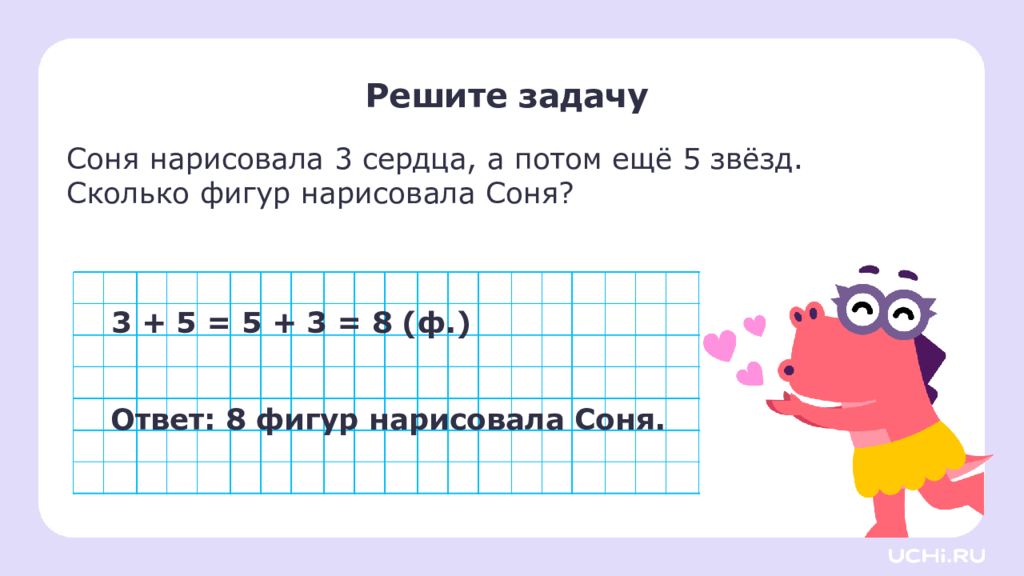 Соня нарисовала 3 сердца, а потом ещё 5 звёзд. Сколько фигур нарисовала Соня? Решите задачу 3 + 5 = 5 + 3 = 8 (ф.) Ответ: 8 фигур нарисовала Соня.