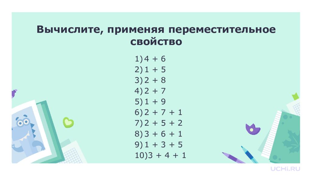Вычислите, применяя переместительное свойство 4 + 6 1 + 5 2 + 8 2 + 7 1 + 9 2 + 7 + 1 2 + 5 + 2 3 + 6 + 1 1 + 3 + 5 3 + 4 + 1