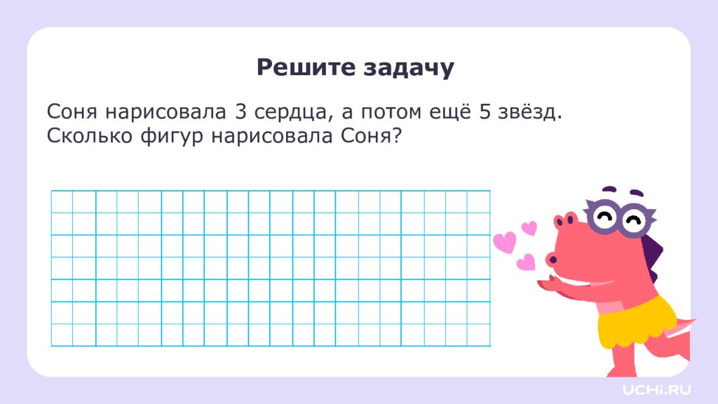 Соня нарисовала 3 сердца, а потом ещё 5 звёзд. Сколько фигур нарисовала Соня? Решите задачу