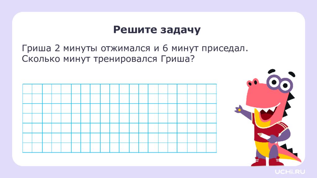 Решите задачу Гриша 2 минуты отжимался и 6 минут приседал. Сколько минут тренировался Гриша?