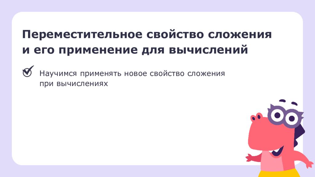 Переместительное свойство сложения и его применение для вычислений Научимся применять новое свойство сложения при вычислениях