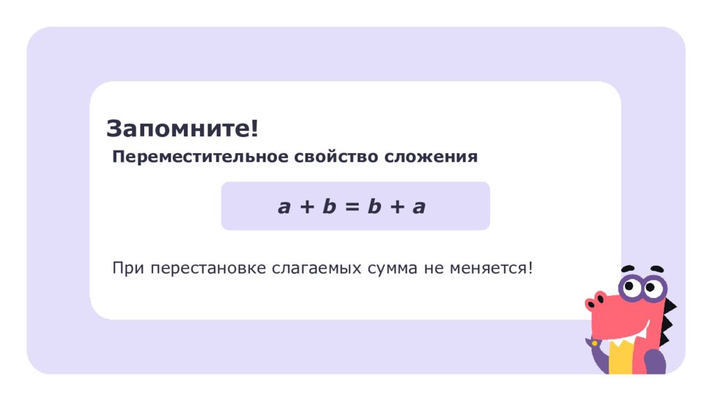 Запомните! Переместительное свойство сложения При перестановке слагаемых сумма не меняется! a + b = b + a