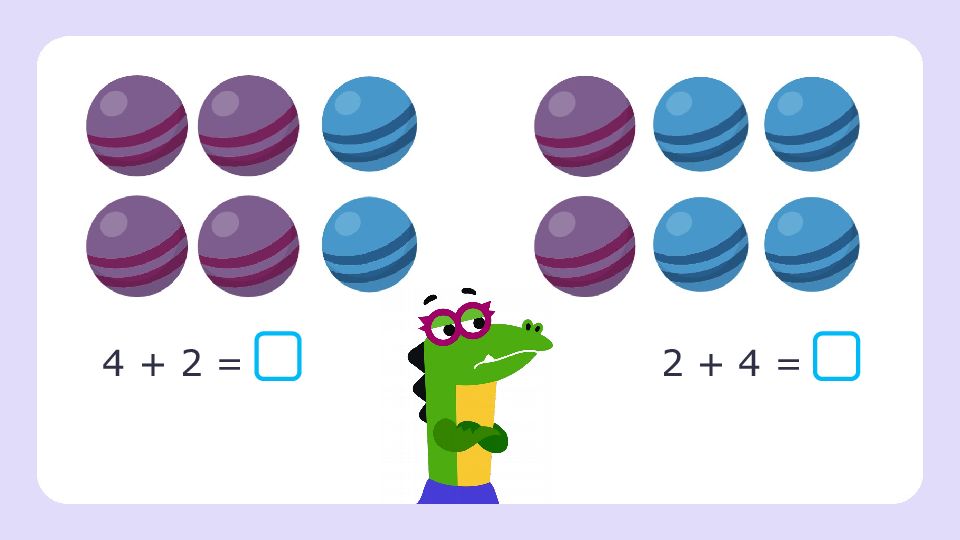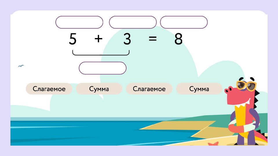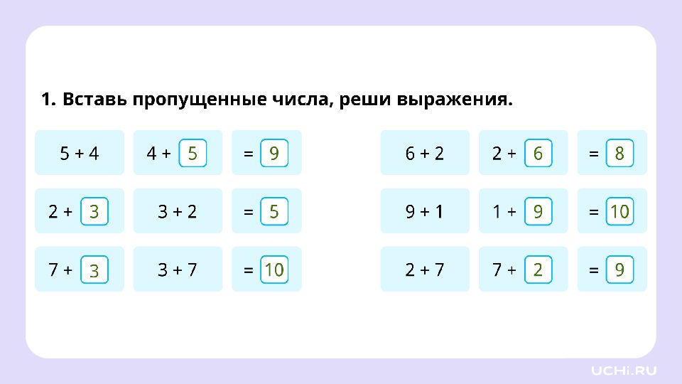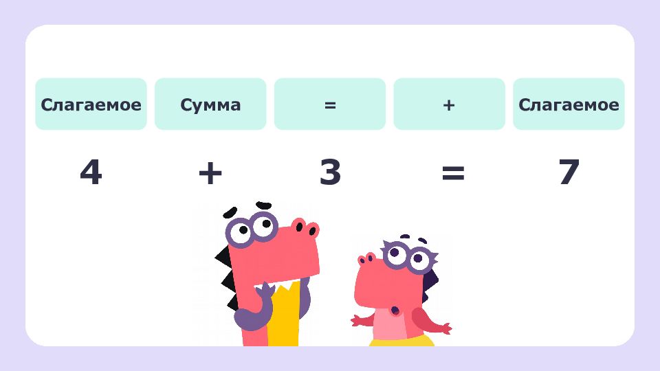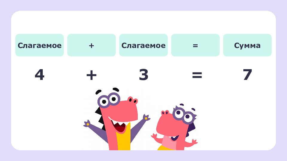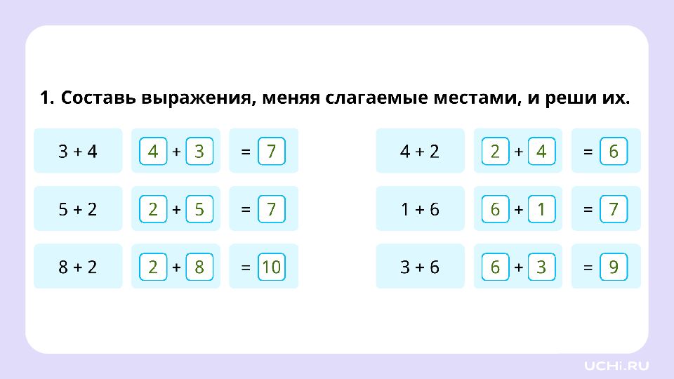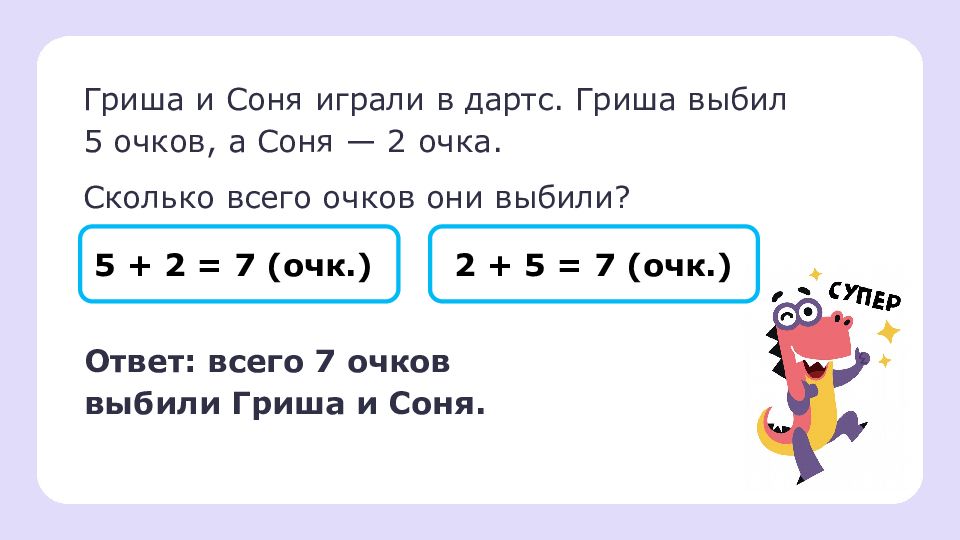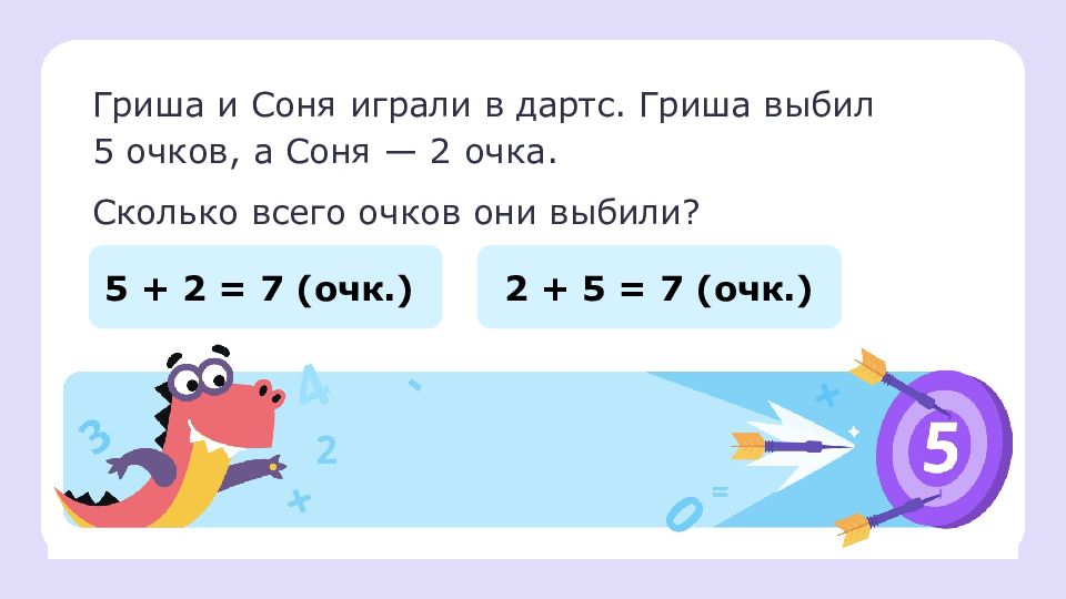 Гриша и Соня играли в дартс. Гриша выбил 5 очков, а Соня — 2 очка. Сколько всего очков они выбили? 5 + 2 = 7 (очк.) 2 + 5 = 7 (очк.)