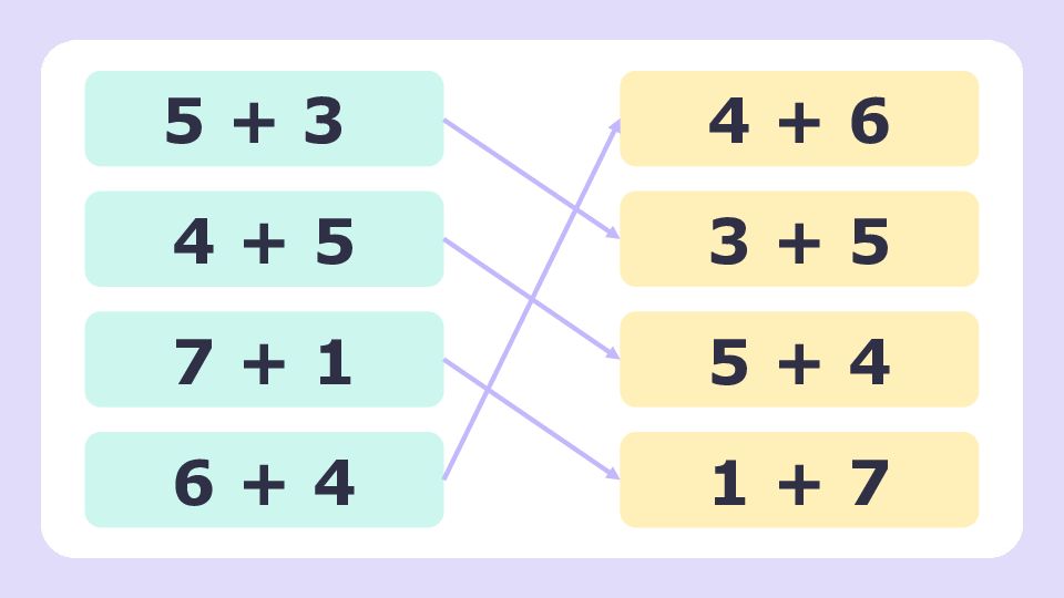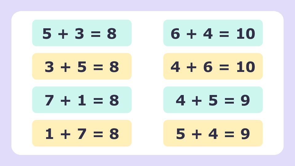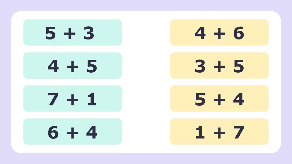 5 + 3 = 8 3 + 5 = 8 7 + 1 = 8 1 + 7 = 8 6 + 4 = 10 4 + 6 = 10 4 + 5 = 9 5 + 4 = 9