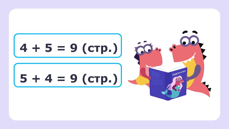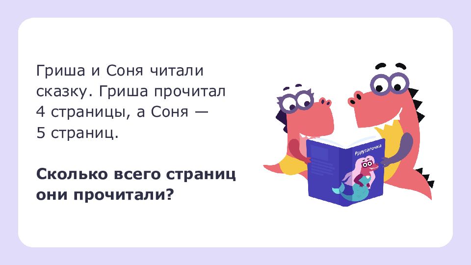 Гриша и Соня читали сказку. Гриша прочитал 4 страницы, а Соня — 5 страниц. Сколько всего страниц они прочитали?