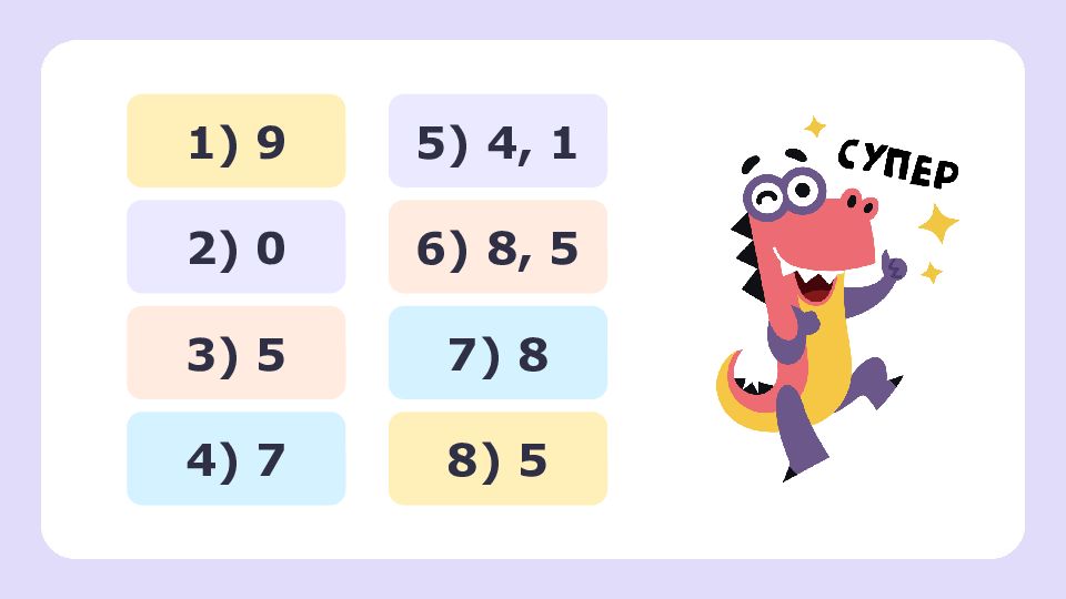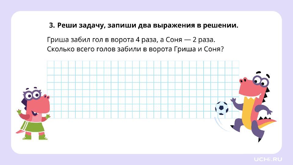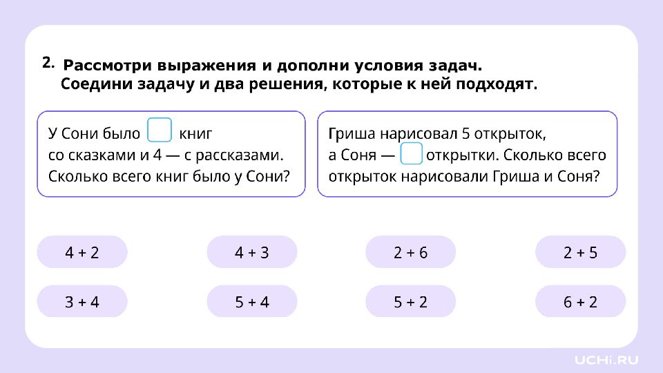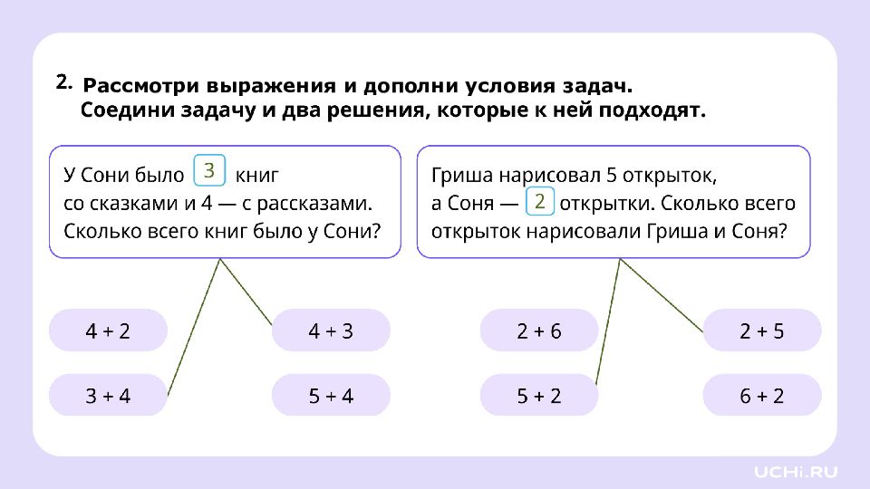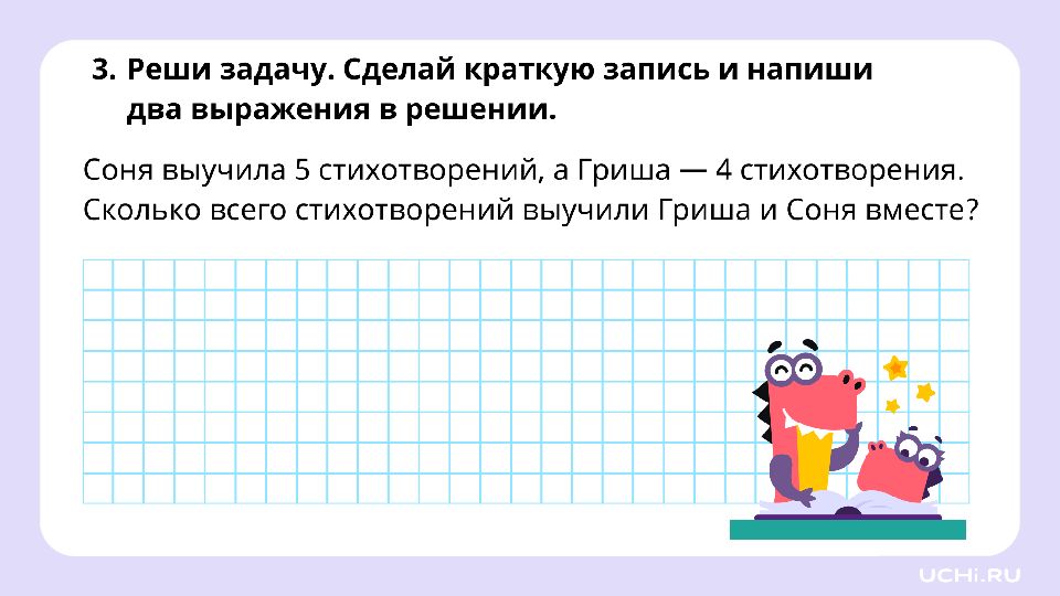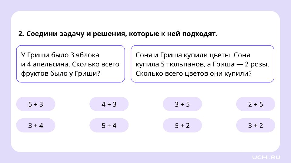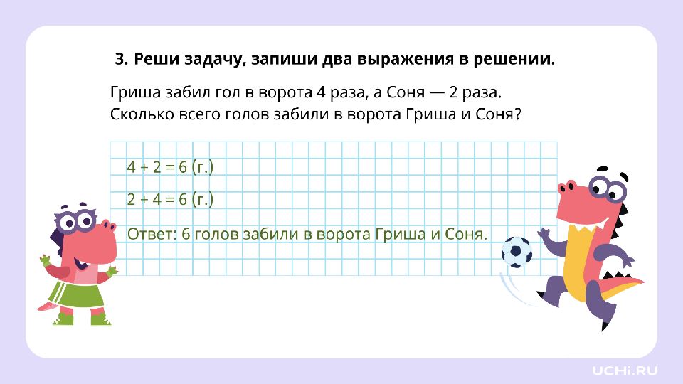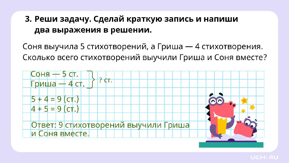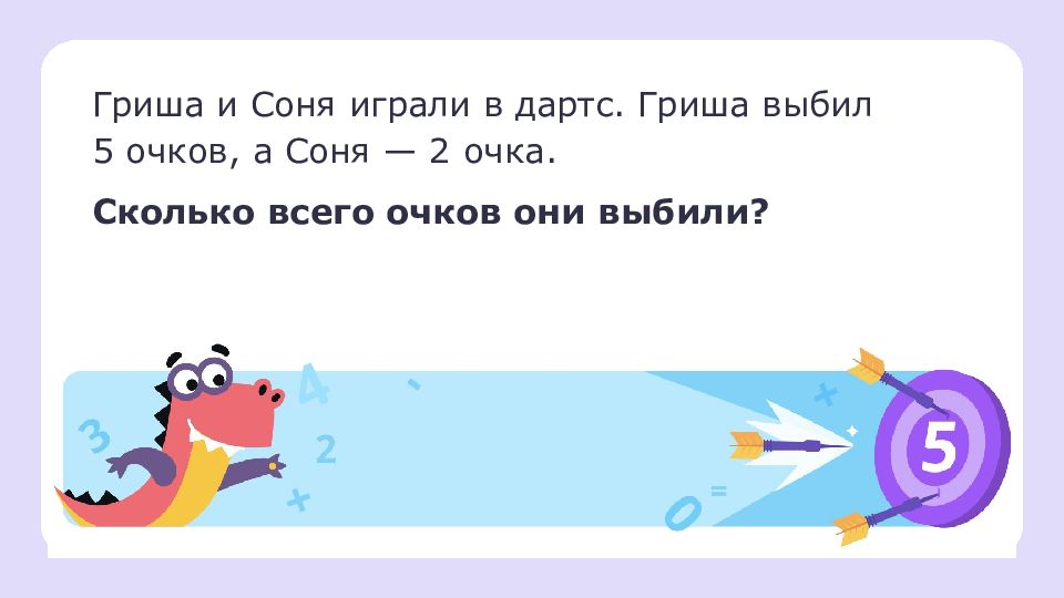 Ответ: всего 7 очков выбили Гриша и Соня. Гриша и Соня играли в дартс. Гриша выбил 5 очков, а Соня — 2 очка. Сколько всего очков они выбили? 5 + 2 = 7 (очк.) 2 + 5 = 7 (очк.)
