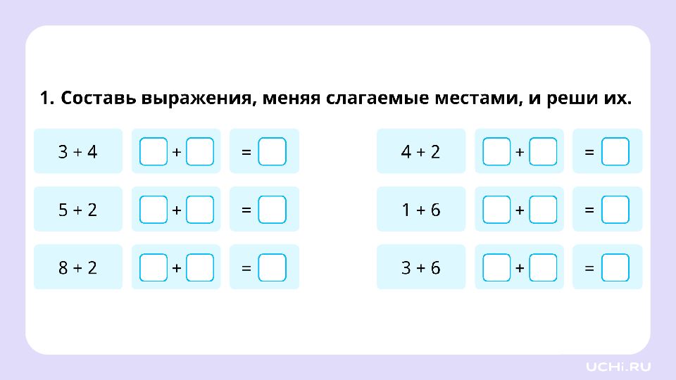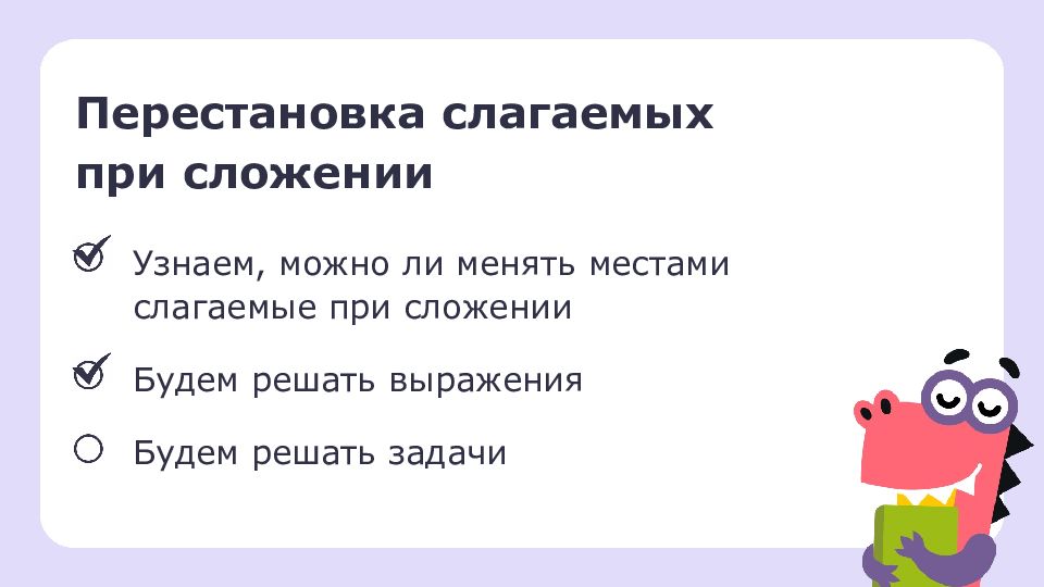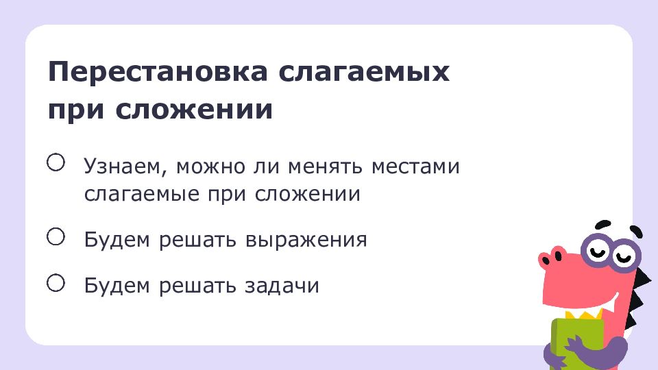 Перестановка слагаемых при сложении Узнаем, можно ли менять местами слагаемые при сложении Будем решать выражения Будем решать задачи