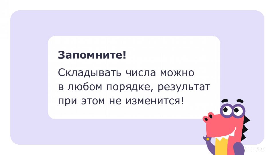 Запомните! Складывать числа можно в любом порядке, результат при этом не изменится!