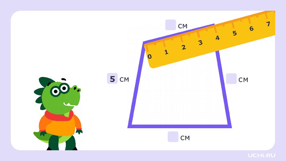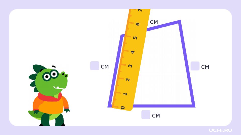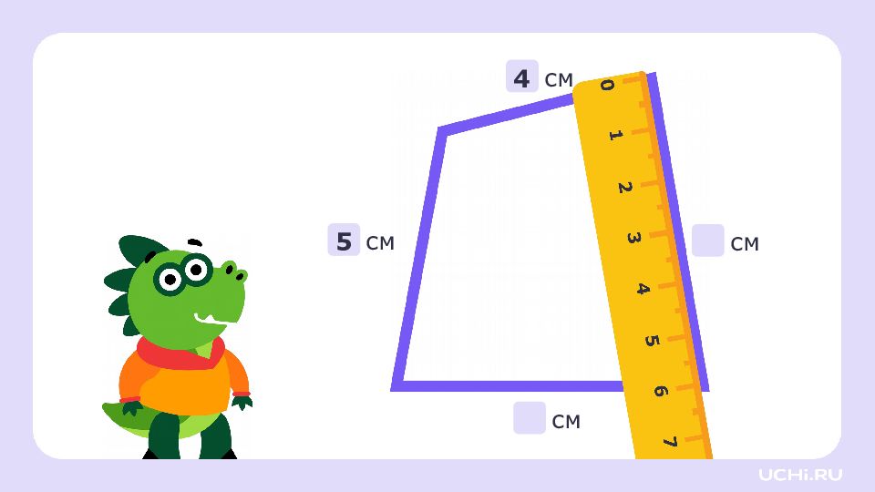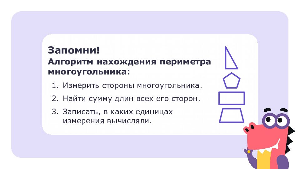 Запомни! Алгоритм нахождения периметра многоугольника: Измерить стороны многоугольника. Найти сумму длин всех его сторон. Записать, в каких единицах измерения вычисляли.