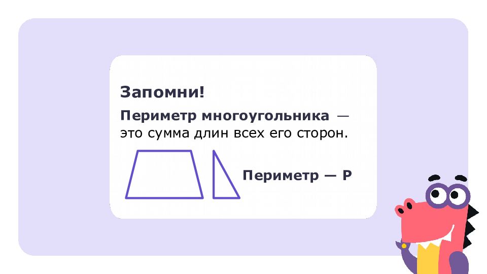 Запомни! Периметр многоугольника — это сумма длин всех его сторон. Периметр — Р