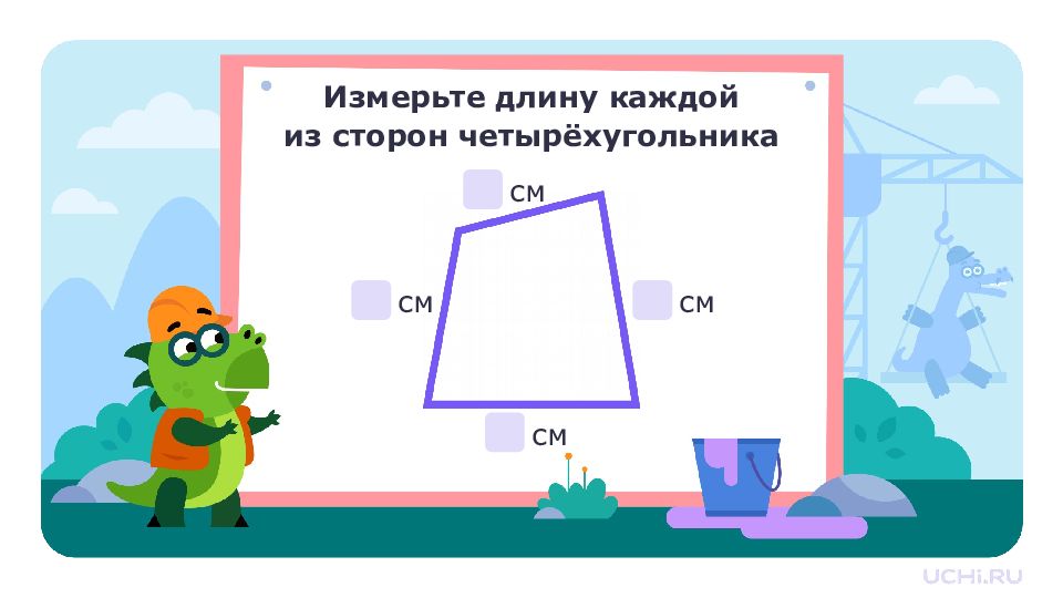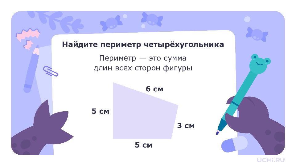 Найдите периметр четырёхугольника Периметр — это сумма длин всех сторон фигуры