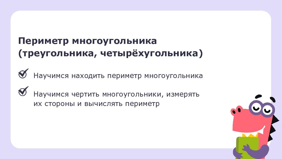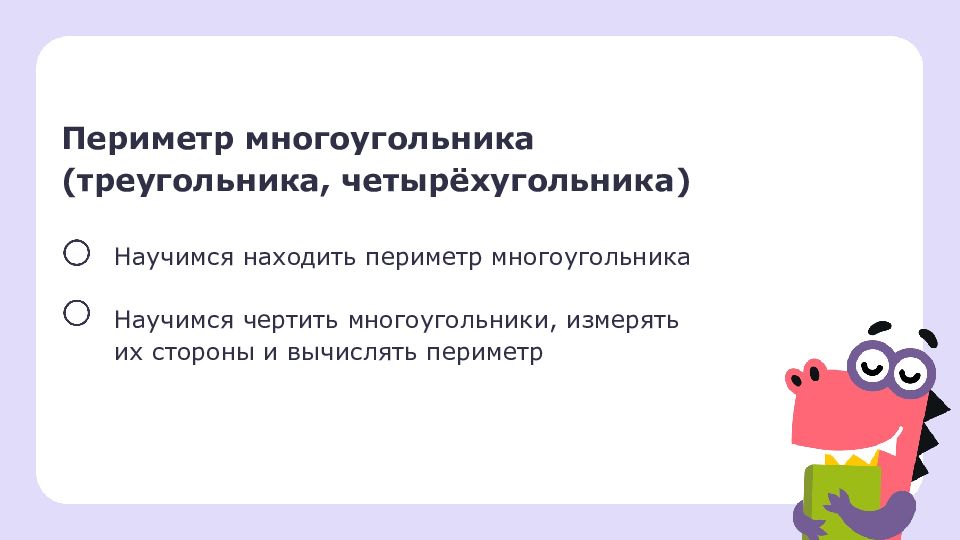 Периметр многоугольника (треугольника, четырёхугольника) Научимся находить периметр многоугольника Научимся чертить многоугольники, измерять их стороны и вычислять периметр