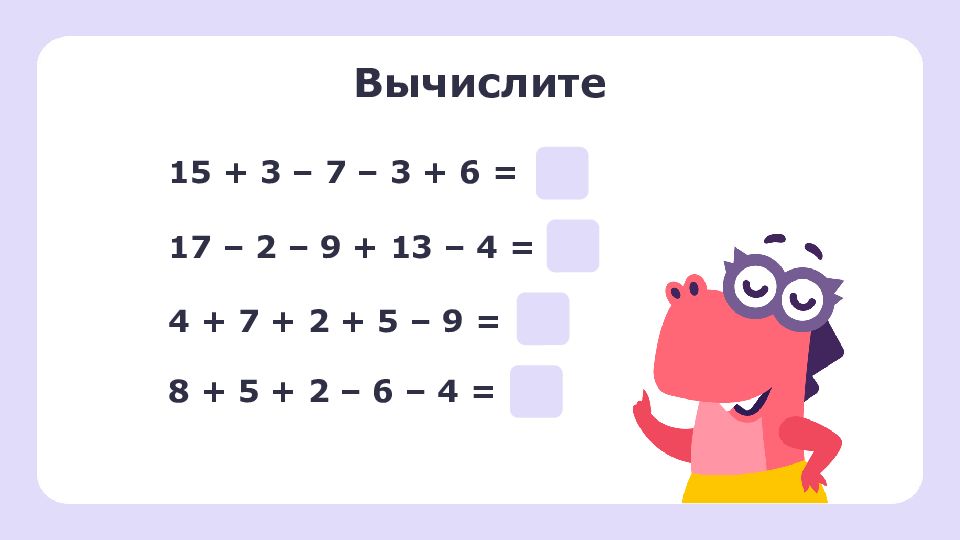 Вычислите 15 + 3 – 7 – 3 + 6 = 17 – 2 – 9 + 13 – 4 = 4 + 7 + 2 + 5 – 9 = 8 + 5 + 2 – 6 – 4 =