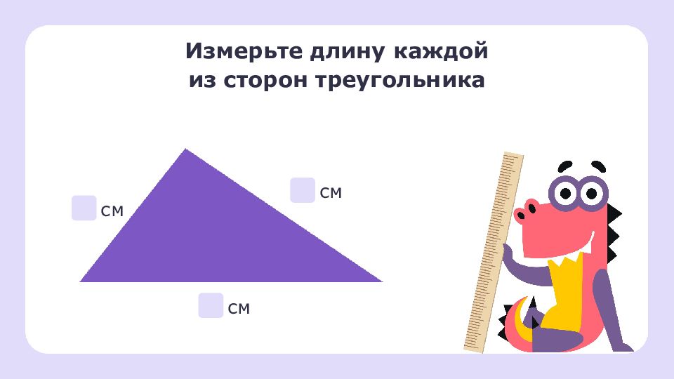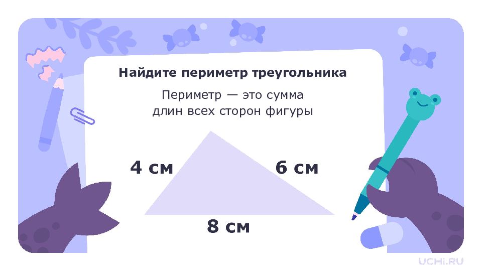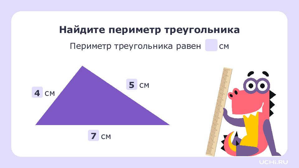 Найдите периметр треугольника Периметр — это сумма длин всех сторон фигуры
