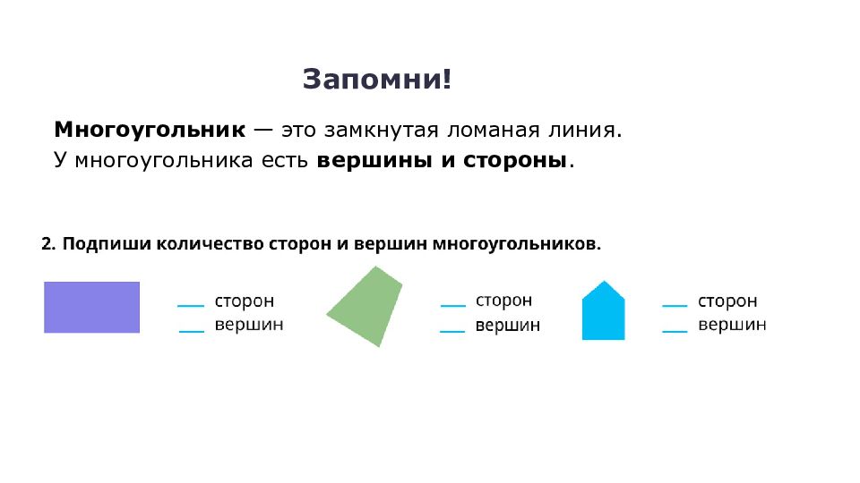 Многоугольник — это замкнутая ломаная линия. У многоугольника есть вершины и стороны. Запомни!
