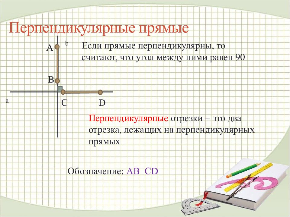 а b Если прямые перпендикулярны, то считают, что угол между ними равен 90 Перпендикулярные отрезки – это два отрезка, лежащих на перпендикулярных прямых C D B A Обозначение: АВ CD