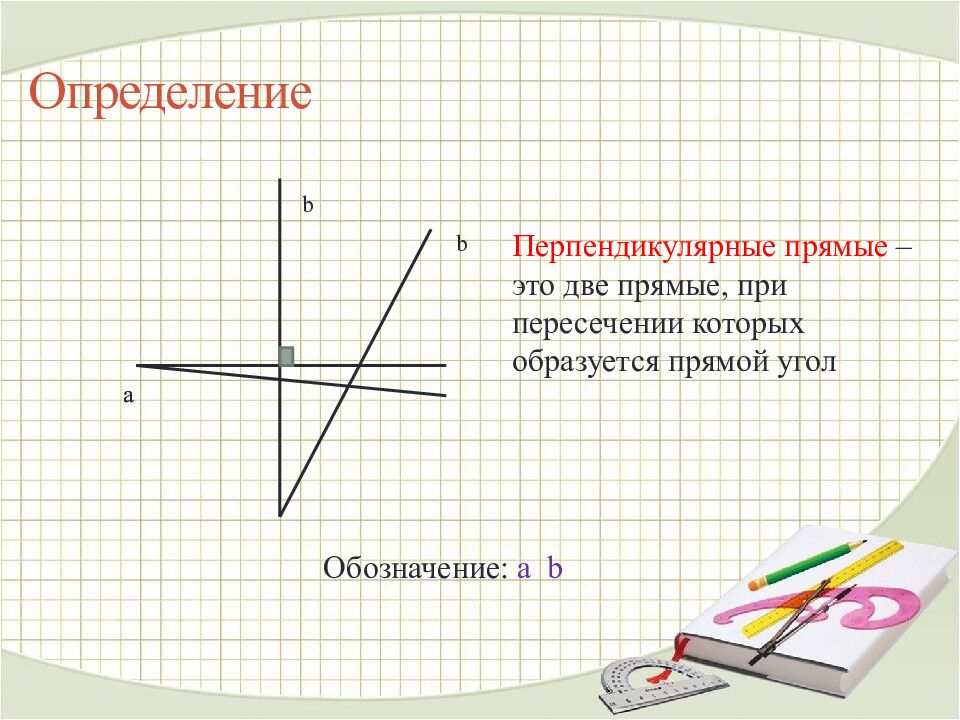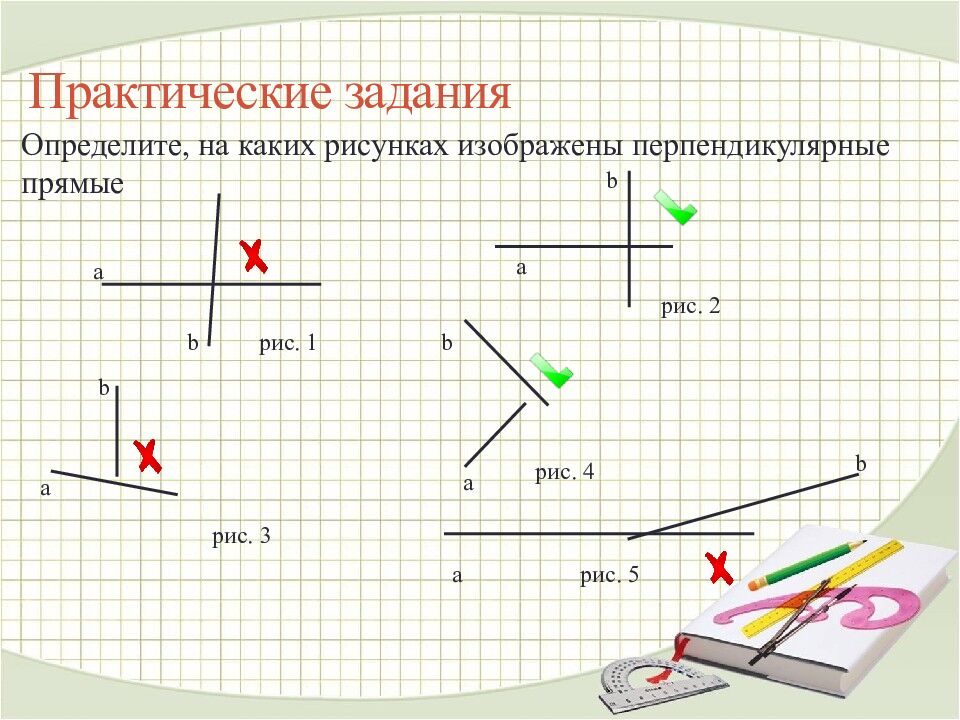 Определите, на каких рисунках изображены перпендикулярные прямые a b рис. 1 a b рис. 3 a b рис. 4 a b рис. 5 a рис. 2 b