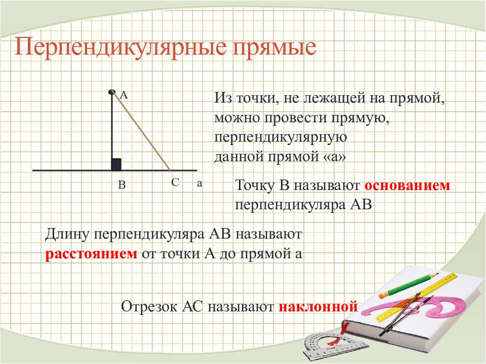 а А В Из точки, не лежащей на прямой, можно провести прямую, перпендикулярную данной прямой «а» Длину перпендикуляра АВ называют расстоянием от точки А до прямой а С Отрезок АС называют наклонной Точку В называют основанием перпендикуляра АВ