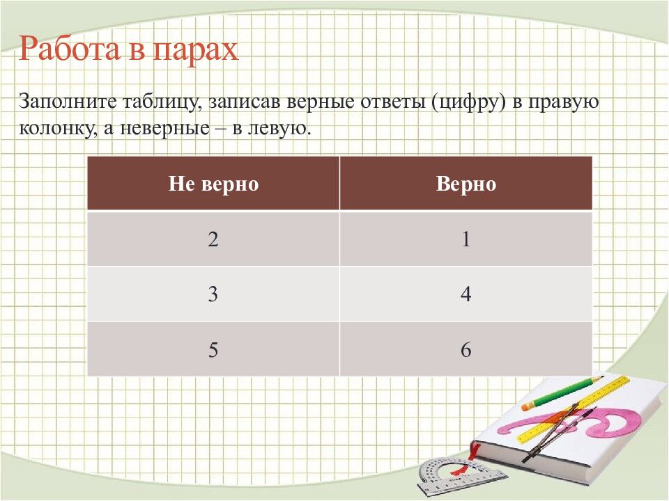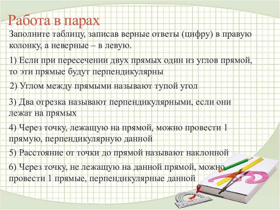 Заполните таблицу, записав верные ответы (цифру) в правую колонку, а неверные – в левую. 1) Если при пересечении двух прямых один из углов прямой, то эти прямые будут перпендикулярны 2) Углом между прямыми называют тупой угол 3) Два отрезка называют перпендикулярными, если они лежат на прямых 4) Через точку, лежащую на прямой, можно провести 1 прямую, перпендикулярную данной 5) Расстояние от точки до прямой называют наклонной 6) Через точку, не лежащую на данной прямой, можно провести 1 прямые, перпендикулярные данной