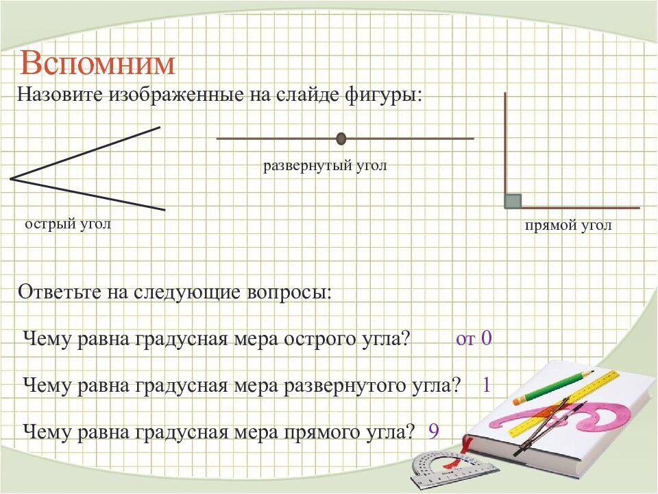 Назовите изображенные на слайде фигуры: острый угол прямой угол развернутый угол Ответьте на следующие вопросы: Чему равна градусная мера острого угла? от 0 Чему равна градусная мера развернутого угла? 1 Чему равна градусная мера прямого угла? 9