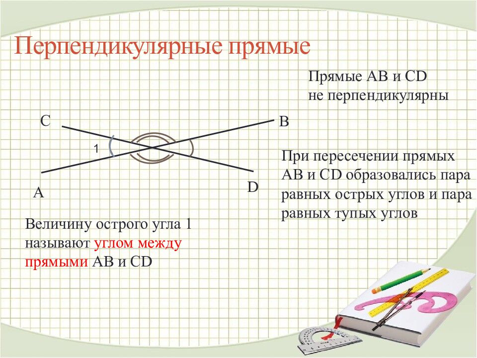 А B C D Прямые AB и CD не перпендикулярны При пересечении прямых AB и CD образовались пара равных острых углов и пара равных тупых углов Величину острого угла 1 называют углом между прямыми AB и CD 1