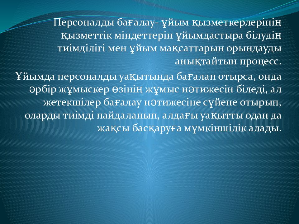 Персоналды бағалау- ұйым қызметкерлерінің қызметтік міндеттерін ұйымдастыра білудің тиімділігі мен ұйым мақсаттарын орындауды анықтайтын процесс. Ұйымда персоналды уақытында бағалап отырса, онда әрбір жұмыскер өзінің жұмыс нәтижесін біледі, ал жетекшілер бағалау нәтижесіне сүйене отырып, оларды тиімді пайдаланып, алдағы уақытты одан да жақсы басқаруға мүмкіншілік алады.