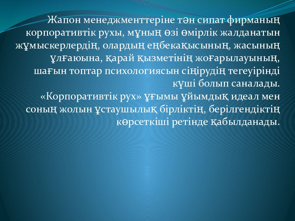 Жапон менеджменттеріне тән сипат фирманың корпоративтік рухы, мұның өзі өмірлік жалданатын жұмыскерлердің, олардың еңбекақысының, жасының ұлғаюына, қарай қызметінің жоғарылауының, шағын топтар психологиясын сіңірудің тегеуірінді күші болып саналады. «Корпоративтік рух» ұғымы ұйымдық идеал мен соның жолын ұстаушылық бірліктің, берілгендіктің көрсеткіші ретінде қабылданады.